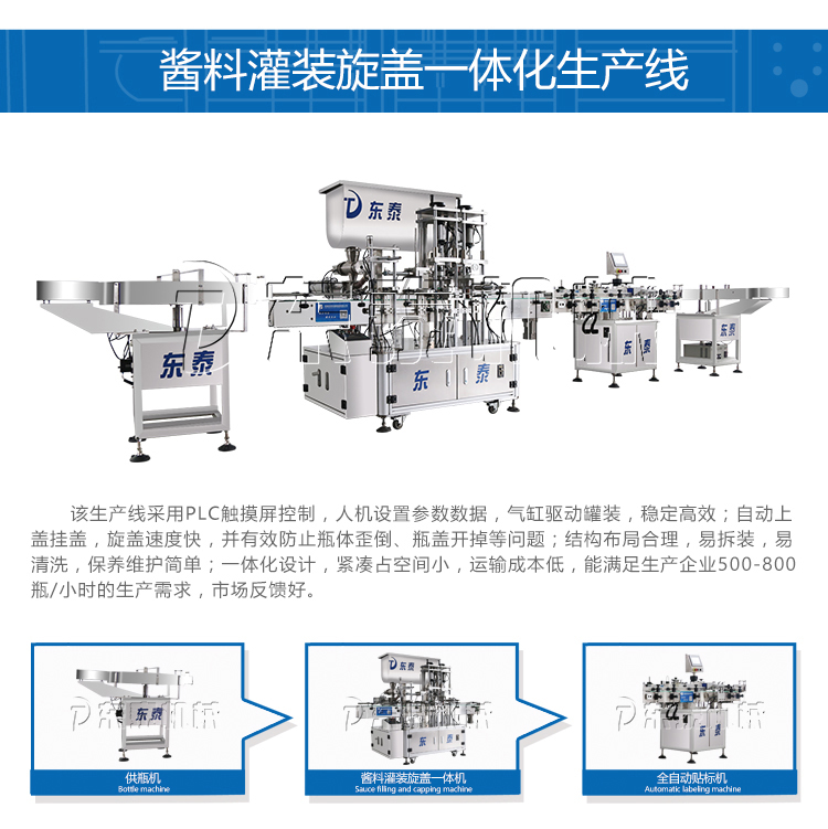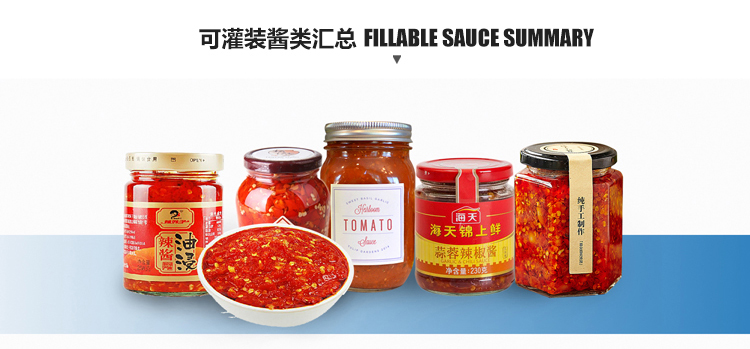 如果是瓶裝的話,可以建議使用我們的辣椒醬灌裝旋蓋一體機。在一臺機械上實現(xiàn)上蓋灌裝抽真空旋蓋等動作。該設(shè)備可以通過大顆粒醬料,攪拌均勻,具有灌裝精密,運行穩(wěn)定可靠、工作效率高、壽命長、維護間單等特點。廣泛適用于各種含顆粒的半流體、膏體、醬料的灌裝,也可灌裝各種粘稠體等,價格方面也非常合適。