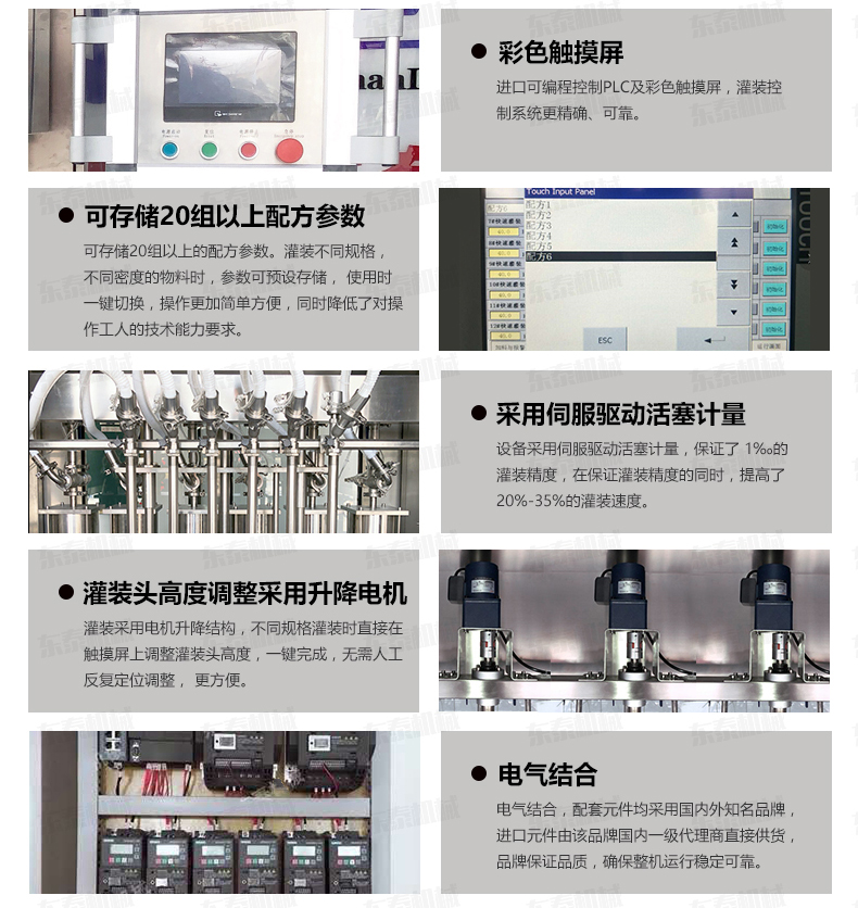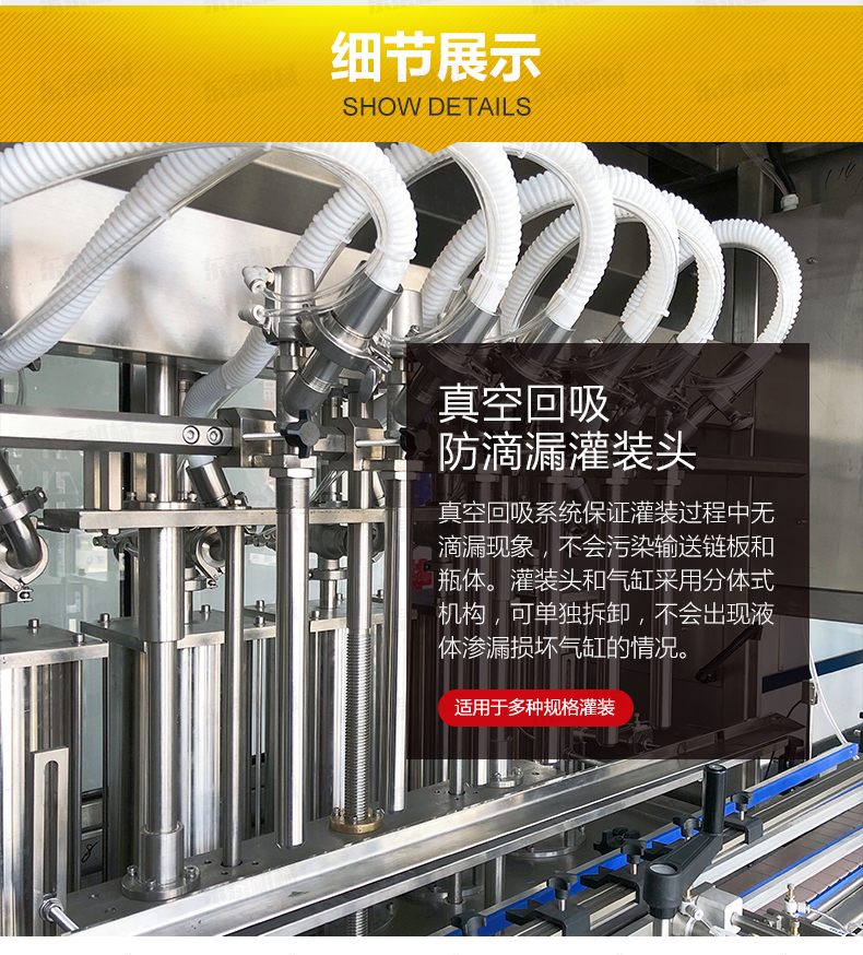 5、具有無瓶不灌裝、自動(dòng)進(jìn)瓶出瓶、自動(dòng)定位灌裝、自動(dòng)控制液位等功能,自動(dòng)化程度高;灌裝嘴設(shè)計(jì)科學(xué)合理,配防滴漏裝置,灌裝不滴漏,擁有物料瓶及設(shè)備的干凈衛(wèi)生。